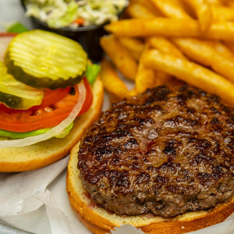 Served on a Kaiser roll with lettuce, tomato, onion, and pickle with your choice of 2 sides: Fries, Coleslaw, Potato Salad, or Rice | Substitute Onion Rings, Fresh Homemade Potato Chips, a Side Salad, Black Beans and Rice, or Vegetable of The Day for +$3.00 each • Add to any sandwich: Cheese (American, Swiss, Mozzarella, Cheddar, or Pepper Jack), Mushrooms, Grilled Onions & Peppers for +$1.00 for each item | Add Bacon or Served on Garlic Bread for +$2.00 for each item.